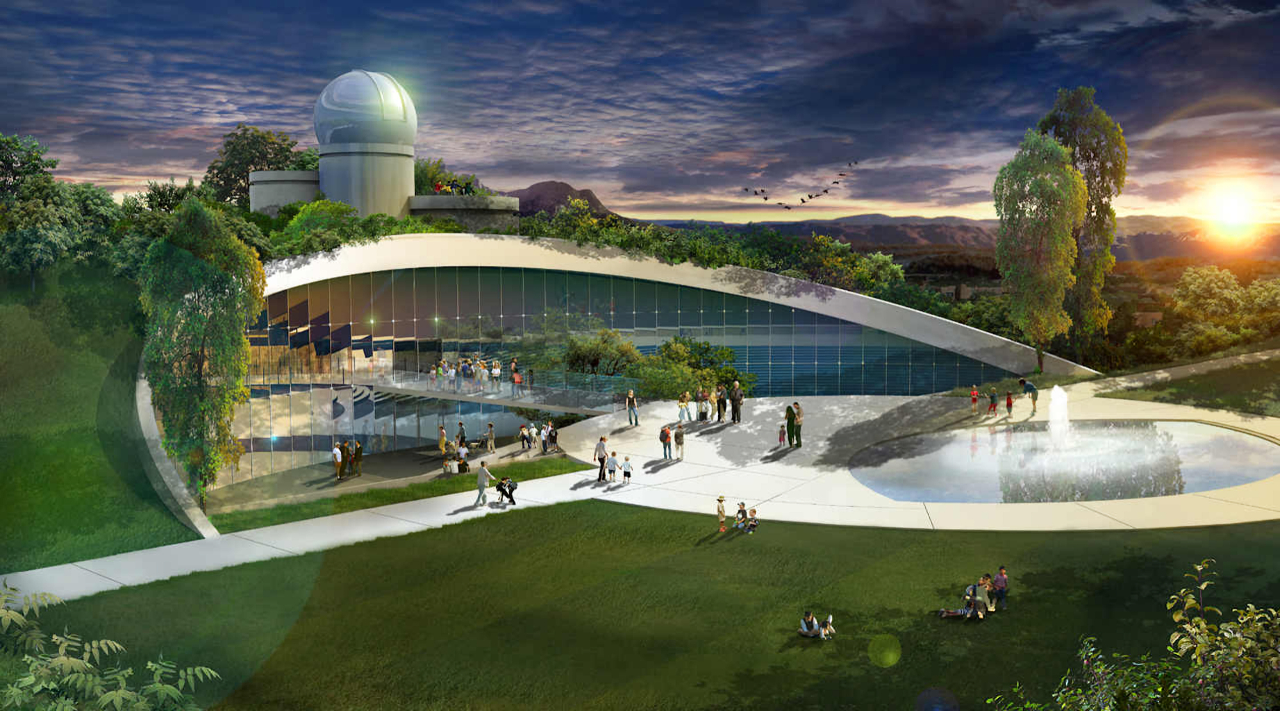 This two-story Natural History and Science building has 34,000 square feet of gallery space introducing visitors to the unique relationships between the San Joaquin Valley and the human population beginning with the Tachi Yokuts people between 1000-500 B.C.. The structure is a concrete shell with a landscaped earthen covering. The lower floor features dioramas relating to the San Joaquin River, and the ground level second floor will have a Visitors Center, Gift Shop, exhibition galleries, and a day care center. A small third floor area will house an observatory with a state-of-the-art digital telescope, and exterior terraces for portable telescopes and special events.